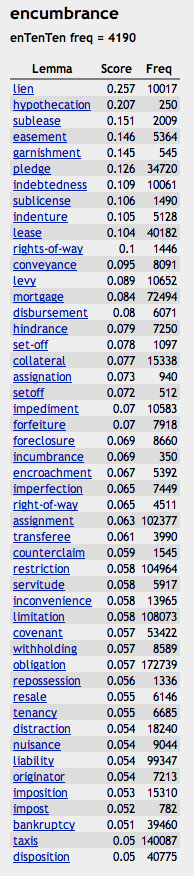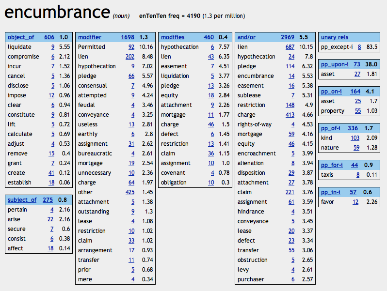 The screenshot below shows a Word Sketch for the word “encumbrance”. You can see which other words (verbs, adjectives, adverbs) are often used with it, and which words are its partners in binomials – with and/or (e.g. lien or encumbrance). You can also be presented with a thesaurus list (see screenshot at the end of this post).