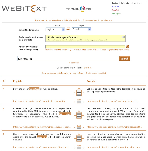 Today I’d like to tell you about a tool called WeBiText, under development at the National Research Council of Canada. It is quite similar to Linguee, a review of which I posted last week – it searches a corpus and provides parallel extracts of translations. WeBiText can produce results for 30 languages, including a few unusual ones such as Inuktitut, Haitian Creole and Welsh.