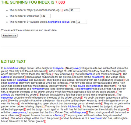 The tool also gives you the Gunning Fog Index number, which tells you the age at which someone would have had to have left full-time education to understand the text.
