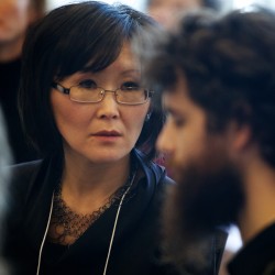Dolgormaa Hersom (left) translates for fellow Russian language interpreter Nathan Williams during a mock arraignment at a training session for court interpreters.