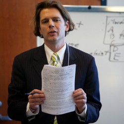 Criminal defense lawyer Merritt Heminway conducts mock court procedures during a training session for interpreters.
