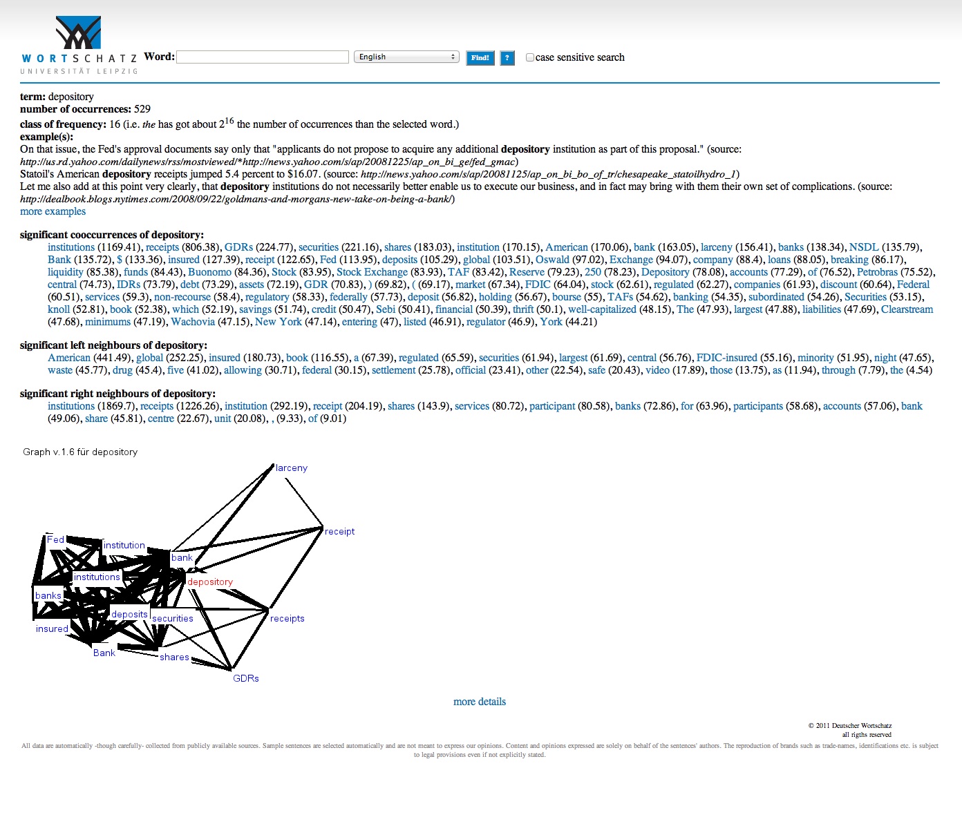 Although the texts making up the databases are general and not specific to law, you can get some really useful information about words, including ‘technical’ ones as you can see below (click to enlarge). In particular you can find collocations – words that often occur nearby – because when you enter a word, you are presented with significant co-occurrences, as well as left and right neighbours of the word, with their frequencies.