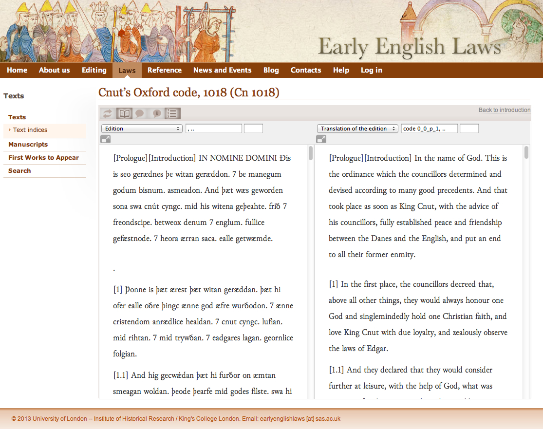 The Early English Laws project is supported by a collaboration between the Institute of Historical Research at the University of London and the Department of Digital Humanities at King’s College London.