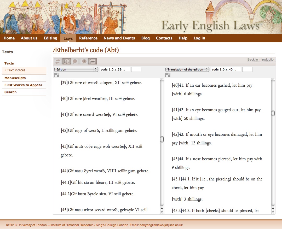 In the screenshot below you can see how a source text (Æthelberht’s Code) and its translation are presented side by side.