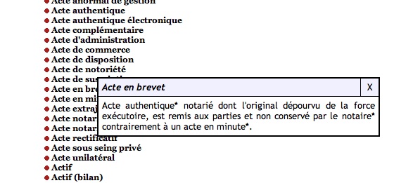 The glossary (lexique juridique et fiscal) is very comprehensive, and efficient to use – by hovering with your mouse over a word, a definition appears.