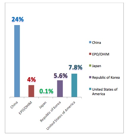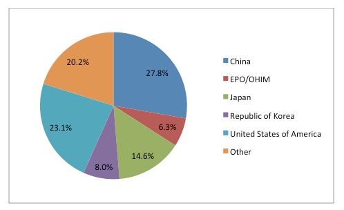Besides China, the majority of patents were filed in the USA, Japan and Korea, with Europe (EPO/OHIM in the graph) representing 6.3% of the total.