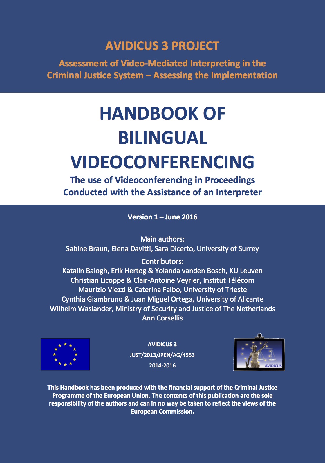 avidicus3My final recommendation is the Handbook of Bilingual Videoconferencing. It is designed to be a comprehensive guide to the use of videoconference (VC) in legal proceedings where such proceedings are conducted with the assistance of an interpreter. It is intended for legal professionals (e.g. judges, lawyers, prosecutors, court clerks, police officers) using VC in their everyday work at different levels; legal interpreters wishing to expand their knowledge about VC communication for their continuous professional development; technicians tasked with installing, maintaining and managing VC equipment, setting up and operating VC sessions; and system designers of VC systems for the justice sector. The 36-page handbook is available here.