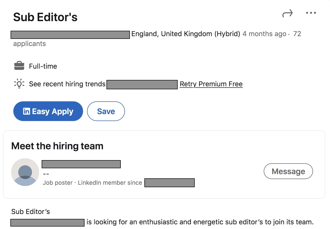 10Oct2022 Monday smile – Editors sorely needed Posted in Monday smiles by WordstoDeeds I’m sure all readers will appreciate this one – an actual job advert on LinkedIn… π± I have redacted the firm’s name to save their embarassment… when they eventually realise… π Share this:Share Click to share on Facebook (Opens in new window) Facebook Click to share on X (Opens in new window) X Click to share on LinkedIn (Opens in new window) LinkedIn Like Loading... Related