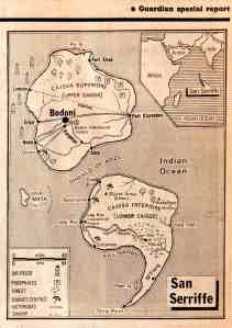 The “small archipelago” “roughly in the shape of a semicolon” with its capital Bodoni lay in the Indian Ocean, occupied by the “irrepressible Flongs” and run with an iron hand by General Pica.